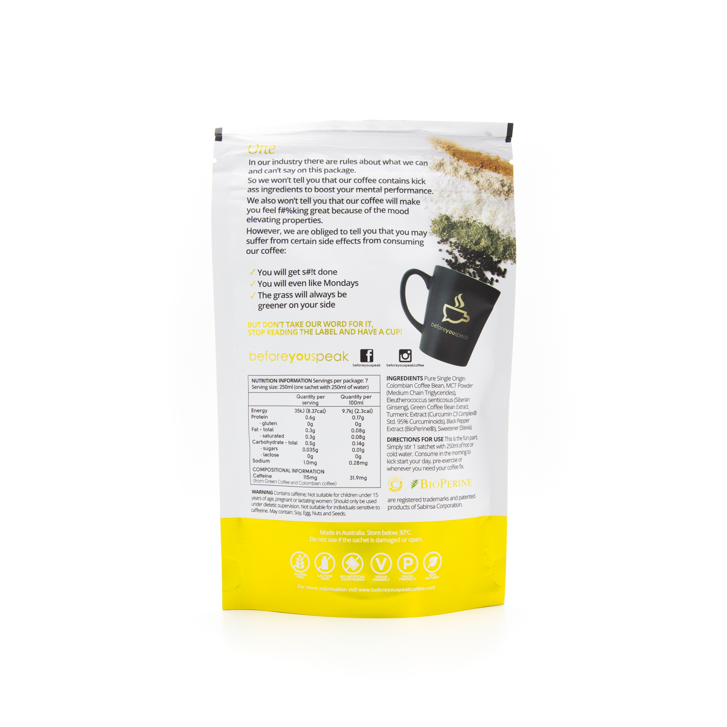 Before You Speak Coffee is not just a regular coffee, it’s a High Performance Coffee infused with superfoods to naturally improve your health, wellbeing and performance. Made from high quality Single Origin Columbian Arabica coffee beans, you’ll be sure to enjoy the smooth, clean aromatic taste of Before You Speak Coffee loaded with antioxidents and nutrients to help boost your matabolism and increase physical performance.